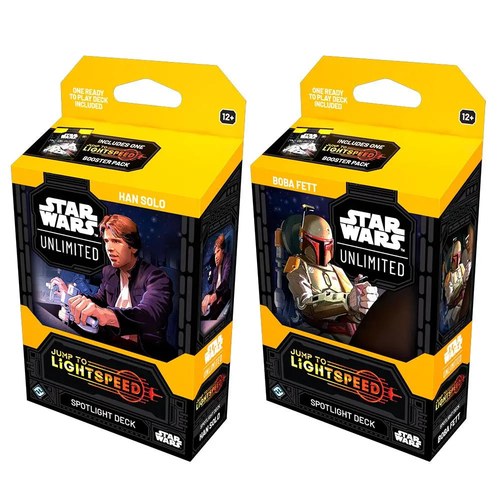 Enter a galaxy of endless possibilities in Star Wars™: Unlimited! In this fast-paced, easy-to-learn trading card game, you and your opponent face off in exciting head-to-head battles full of iconic Star Wars characters. This display contains three copies each of the Boba Fett and Han Solo Spotlight Decks! These pre-built, ready-to-play 50-card decks provides everything you need to dive into the game’s fourth set, Jump to Lightspeed.