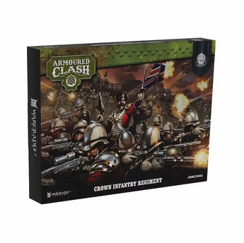 This Armoured Clash Regiment Box provides you with all the ground troops you require to wage war against the other Great Powers with your Crown Force. Stiff upper lipped ranks of Rifle Platoon infantry slam into enemy lines within Stirling Troop Carriers, as the smoky tendrils of daring Spitfire Rocketeers criss-cross overhead. Elite units of Royal Engineer Sappers storm buildings and lie in wait for heavy targets, while Sharp Rifles pick off opposing Infantry Officers, sowing disorder amongst enemy units. And all the while, lines of Drake Field Guns unleash deafening canister shots, churning up ground and body alike.