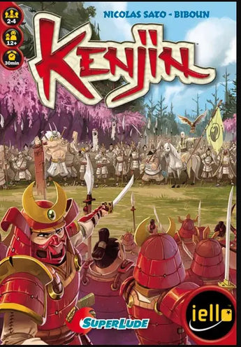 A merciless war is raging throughout feudal Japan, fueled by the hunger for power or the desire for peace of its great lords. As one of them, you must defend your territory from the enemy threatening your borders. Now it's time to command your troops and read through your opponent's strategy to take over the battlefield and prevail!Kenjinis a quick and subtle card game of bluffing and tactics. You share two random battlefields with each of the players next to you: one worth 4 points, the other 6.You get a hand of thirteen cards numbered from 0 to 3. They are your peasants, thugs, lords. On your turn, send two of them to one or two of your battlefields. When all the cards have been played, each battlefield is won by the player with the highest sum of card values there. Some cards are always played face up, others always face down. Some of them also have a special power: Use your peasants (0) to lure your opponent's troops to a battlefield, or to score more points if they survive. Play a Lord (2) early as it's strengthened by each new reinforcement thereafter.Terrains also impact a battle's outcome: Peasants take arms to protect their rice fields, while military strength is not always enough when you fight over a palace. Once each battlefield has been scored, the player with the most victory points wins.