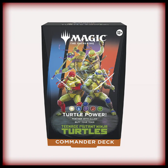 Unleash mutagenic mayhem and battle your friends in Commander, Magic's most popular multiplayer format. Throw down with any two of these partnered pals— Leonardo, Donatello, Raphael, Michelangelo, or Splinter—to customize your playstyle at the table. Each teammate will help in different ways to achieve your goal: build up +1/+1 counters and grow your creatures into the world’s most fearsome fighting team!