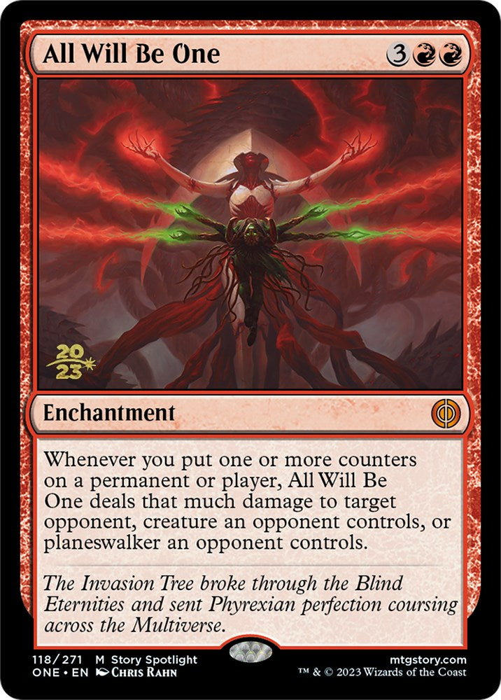 Whenever you put one or more counters on a permanent or player, All Will Be One deals that much damage to target opponent, creature an opponent controls, or planeswalker an opponent controls.