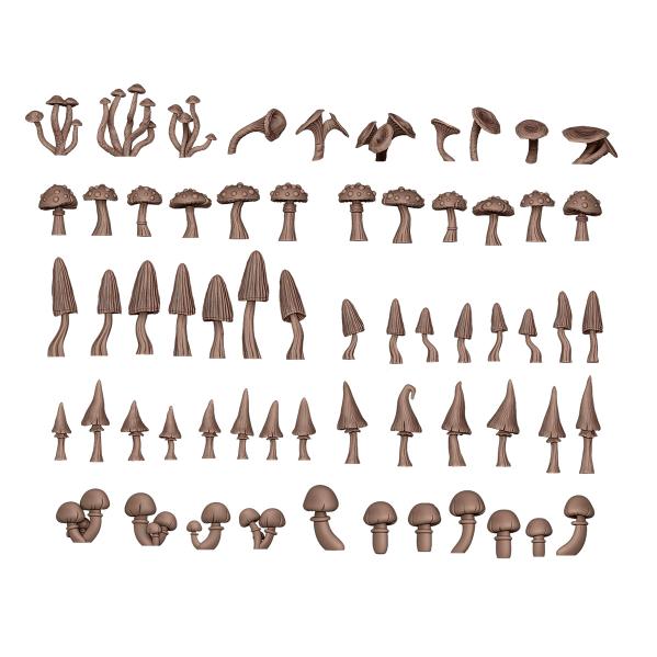 Small, detailed 3D-printed resin mushrooms of different species, ideal for adding a touch of color and fantasy to the bases of your miniatures, dioramas, or gaming tables.