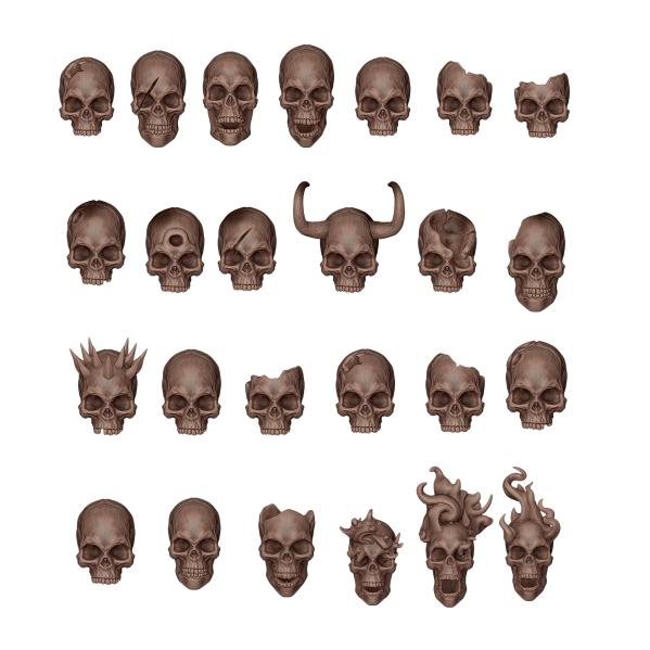 Small, highly detailed 3D-printed resin skulls, perfect for adding a dark and sinister touch to the bases of your miniatures, dioramas, or scenes. Ideal for setting battle scenes, cemeteries, or cursed lands, adding realism and drama to your gaming table.