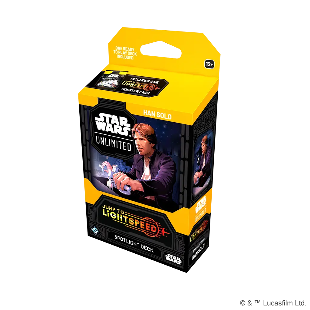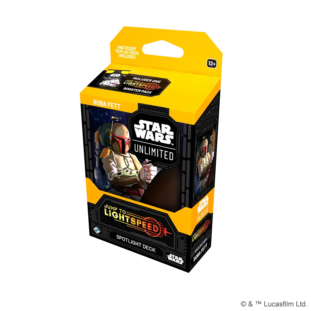 Enter a galaxy of endless possibilities in Star Wars™: Unlimited! In this fast-paced, easy-to-learn trading card game, you and your opponent face off in exciting head-to-head battles full of iconic Star Wars characters. This display contains three copies each of the Boba Fett and Han Solo Spotlight Decks! These pre-built, ready-to-play 50-card decks provides everything you need to dive into the game’s fourth set, Jump to Lightspeed.