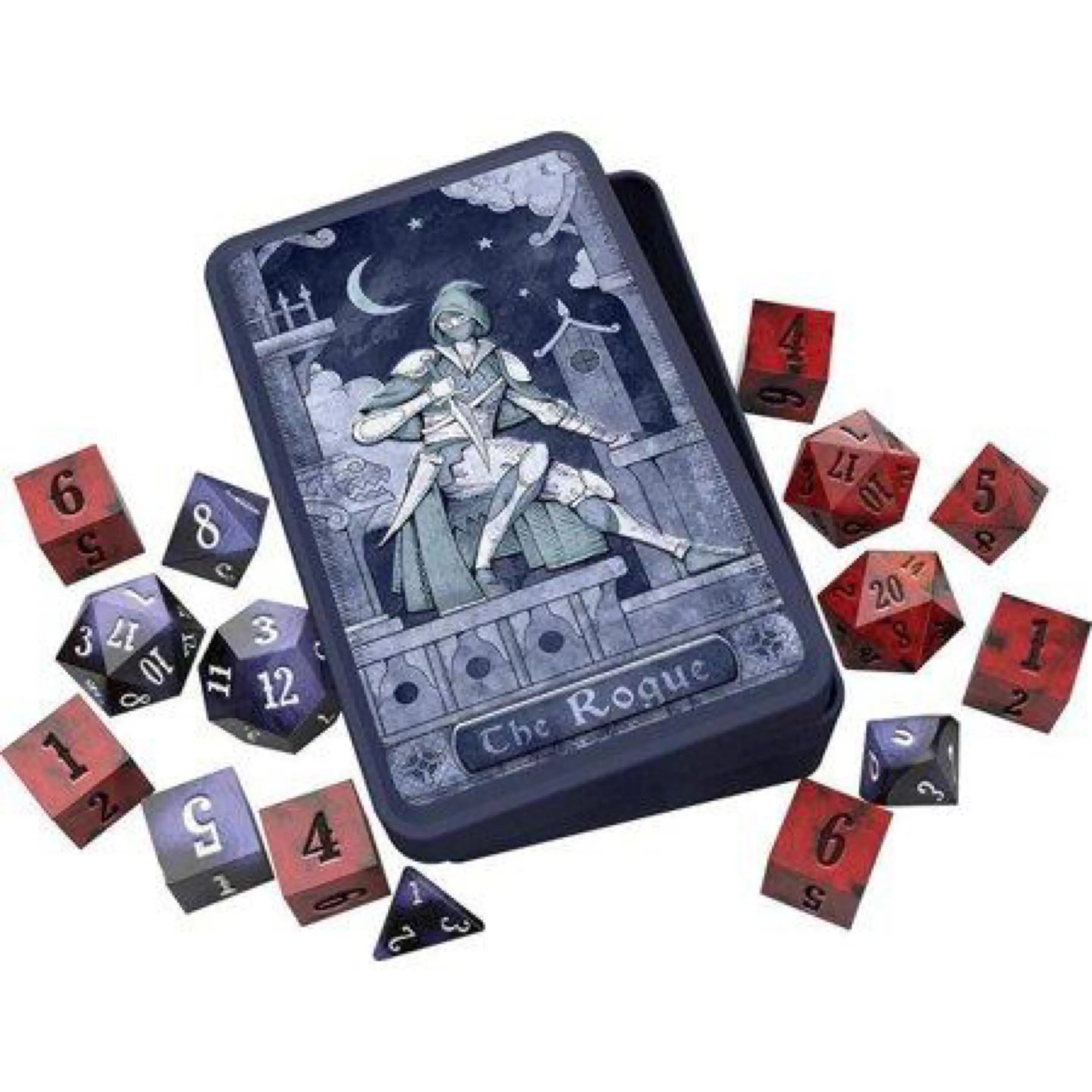 Beautifully designed tins of class-curated dice. Original tarot-style art representing each of the major 5e and Pathfinder classes (and the GM) in a collector’s edition tin. Each set of dice is carefully chosen to suit each class: extra D6’s for the Rogue’s Sneak Attack, extra D4’s for the Wizard’s Magic Missiles, and extra D12’s for the Barbarian’s massive Battle Axe!
