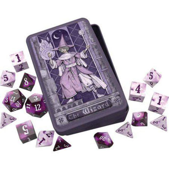 Crack open this ancient tin and summon 16 dice in two color designs, with d4s for your magic missles and extra d6s for your fireballs.