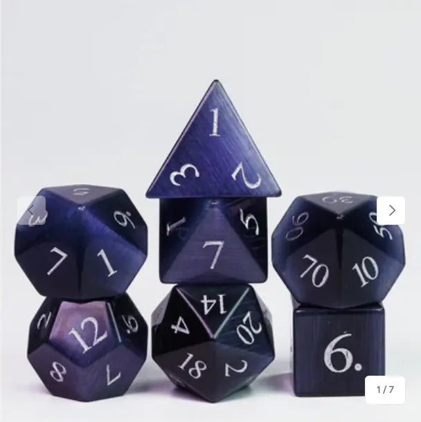 Cat's Eye Purple - Gemstone Engraved with Silver RPG Dice Set