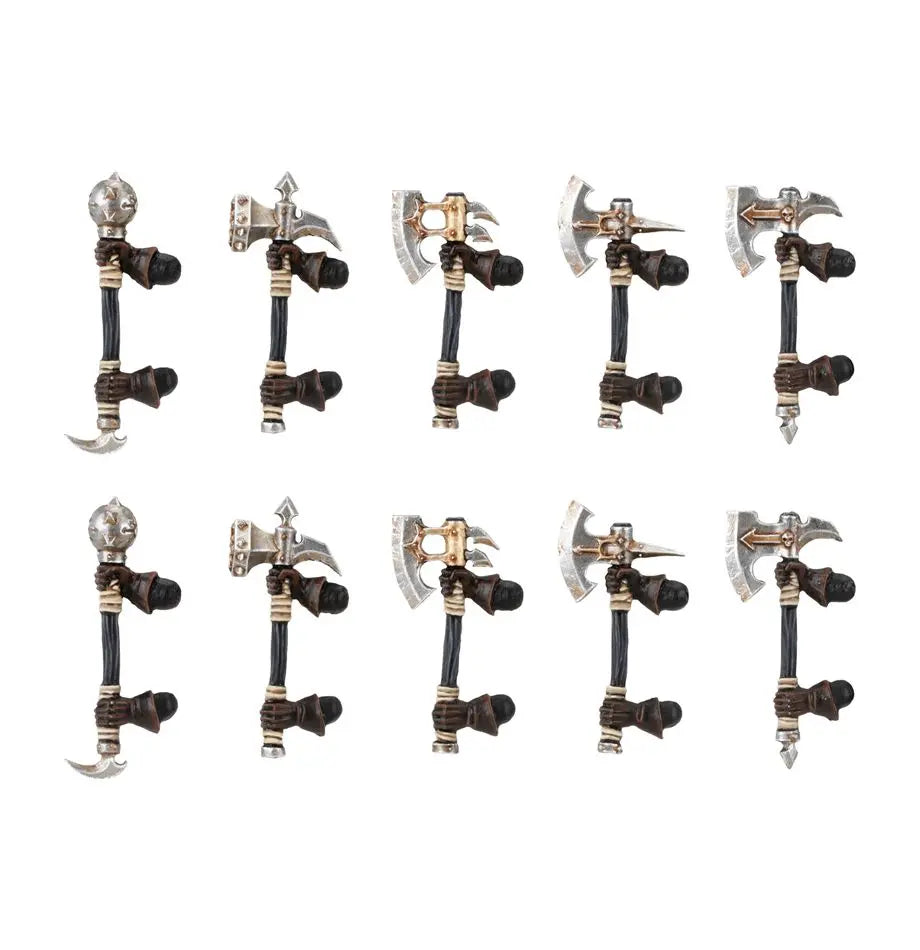 Enhance your Chaos Warriors' destructive power with this upgrade set of 10 great weapons - two great hammers, six greataxes, and a pair of two-handed maces. With these extra-large and heavy weapons, your Chaos Warriors will strike fear into their foes and cut through even the thickest armor. Made from high-quality metal components, these weapons are a must-have for any Warriors of Chaos army in Warhammer: The Old World.