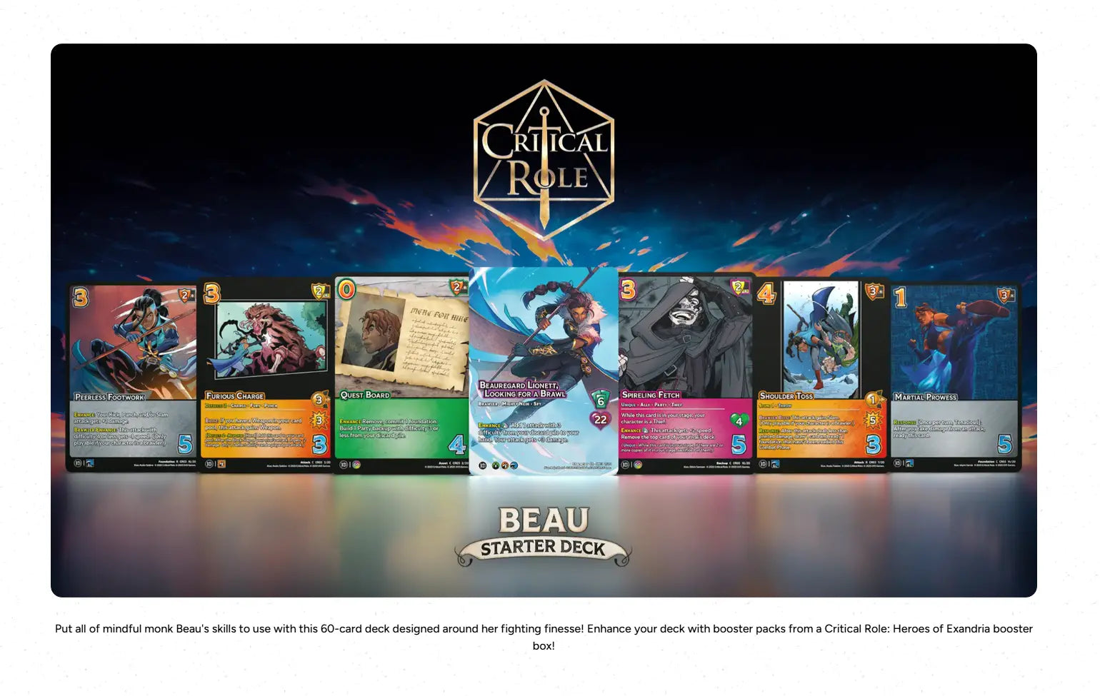 Featuring the no-nonsense monk BEAU, this Starter Deck contains 61 cards (60 cards + 1 character card), and a double-sided paper playmat with learn-to-play instructions!