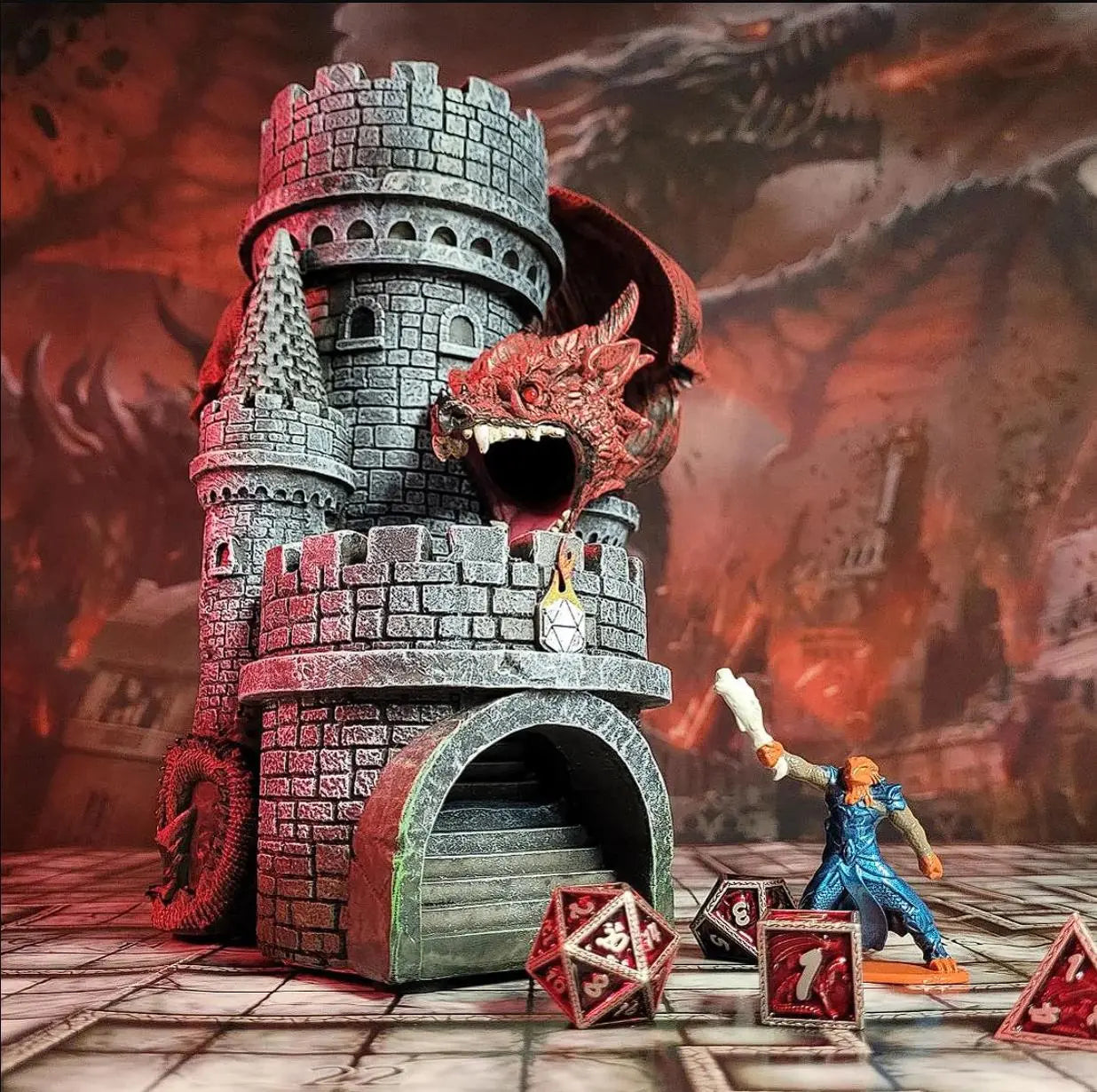 Test your fate with the expertly crafted remote controlled Dragons Keep resin dice tower! This hand-painted, heavy grey stone tower is being protected (...or attacked?!) by a large red dragon! The Dragons Keep makes an awesome tabletop piece for any RPG adventure.COLOR: Grey stone tower with a red dragon.SIZE: Measuring 10 inches tall, 6 inches wide, and 8 inches deep (front to back). Fits polyhedral RPG dice up to 30mm (point-to-point).QUALITY: This dice tower is made from over 3 lbs. of durable, high quality poly-resin.EFFECTS: LEDs in the Dragon's eyes and in the base of the tower are controlled by a multifunction remote control. Dice enter the top of the tower, exit the dragon's mouth, and out the onto the table through the lower tower. NOTE: Batteries not included. Requires 2 AA batteries (not included).PACKAGING: Retail and gift ready with high-quality packaging.Forged Gamingmakes premium tabletop gaming accessories that are functional, affordable, and of the highest quality. We love our products and we think you will, too. If are unsatisfied with your purchase for any reason, just reach out to us and we'll make it right.Let's Roll!