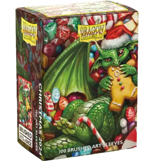 The 2024 Dragon Shield Christmas Brushed Art sleeves feature mischievous dragons indulging in seasonal sweets.