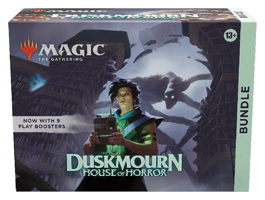 When you’re trapped in the endless halls of Duskmourn, the only way out is through. Band together with plucky survivors and battle your way to the heart of the House. This Duskmourn: House of Horror Bundle contains 9 Duskmourn: House of Horror Play Boosters, plus 1 Traditional Foil card with Bundle-exclusive alternate-art, 15 Traditional Foil and 15 nonfoil Land cards (including 5 foil and 5 nonfoil Full-Art Lands), 1 oversized Spindown life counter, 1 card storage box, and 2 reference cards. Each Play Booster contains 14 Magic: The Gathering cards, including 1–4 cards of rarity Rare or higher and at least 1 Traditional Foil card.