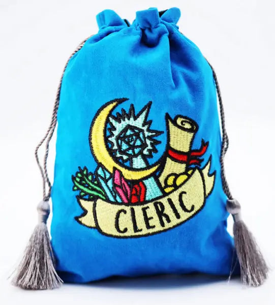 This dice bag is big enough to hold several sets of dice while not being bulky. It has an embroidered design on faux suede with a drawstring closure.
