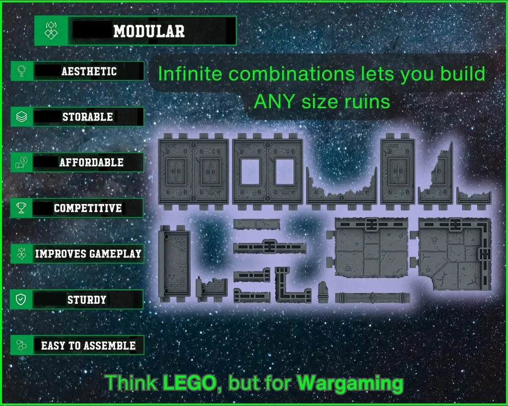 The Full Table Set contains enough Core Components to build a full 60×44″ table of terrain to Games Workshop suggested density/layouts