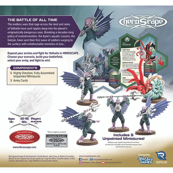 This common army expansion contains one 4-figure common squad and one common hero players can use to customize their armies! The Gelryie Vanguards rise with the tide and can surge forward and strike without warning with Tidal Advance. The Krakenling can teleport across the battlefield, swap places with enemies, and unleash multiple attacks upon your foes. Unleash these aquatic forces upon your enemies!