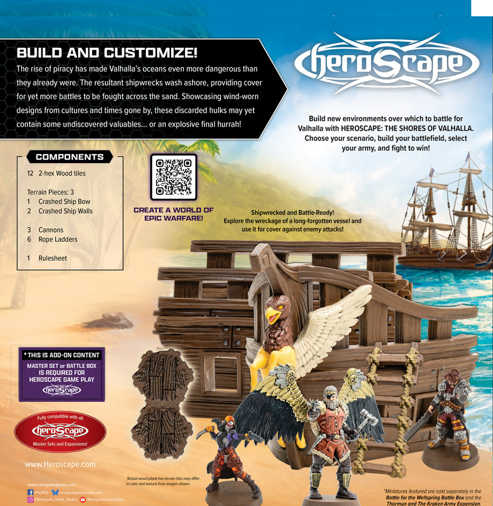 Shores of Valhalla expands your battlefields with wreckage from across time and culture. Ship bows jut from the sand, cannons rest where they fell, and rope ladders hang as remnants of forgotten crews. Whether used as defensive barricades, objectives to fight over, or thematic set pieces, these pieces add depth and story to your battle maps.