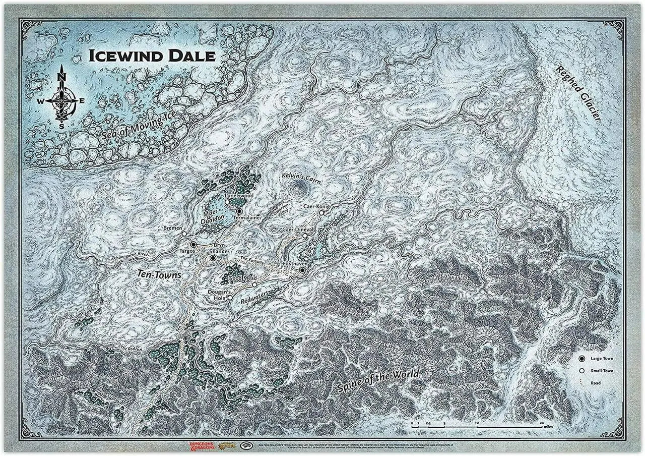Wrapped in winter's bitter embrace, nomadic humans track herds of reindeer through their seasonal migrations, while other brave the hazards of the Sea of Moving Ice in search of such game as fish, seals, walruses, and whales to bolster their communities. In search of shelter and iron, the dwarves dig into the earth. Elsewhere, those descended from venturesome and treasure-hunting immigrants eke out their lives in Ten-Towns, which can hardly keep out the wind, let alone raiding orcs, giants, and monstrous tundra yeti.GF9's Official Dungeons & Dragons Icewind Dale Map has a high-quality vinyl surface, measuring 31" x 21", and ideal for tracking the progress of your adventures during the Icewind Dale, Rime of the Frostmaiden campaign.