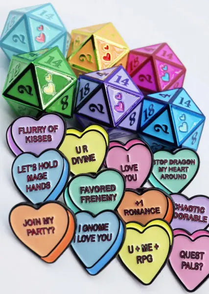 This LIMITED EDITION Complete Set Contains All 6 Colors of double heart D20s and All 13 Pins, including the bonus pin. It is NOT packaged as a mystery product.
