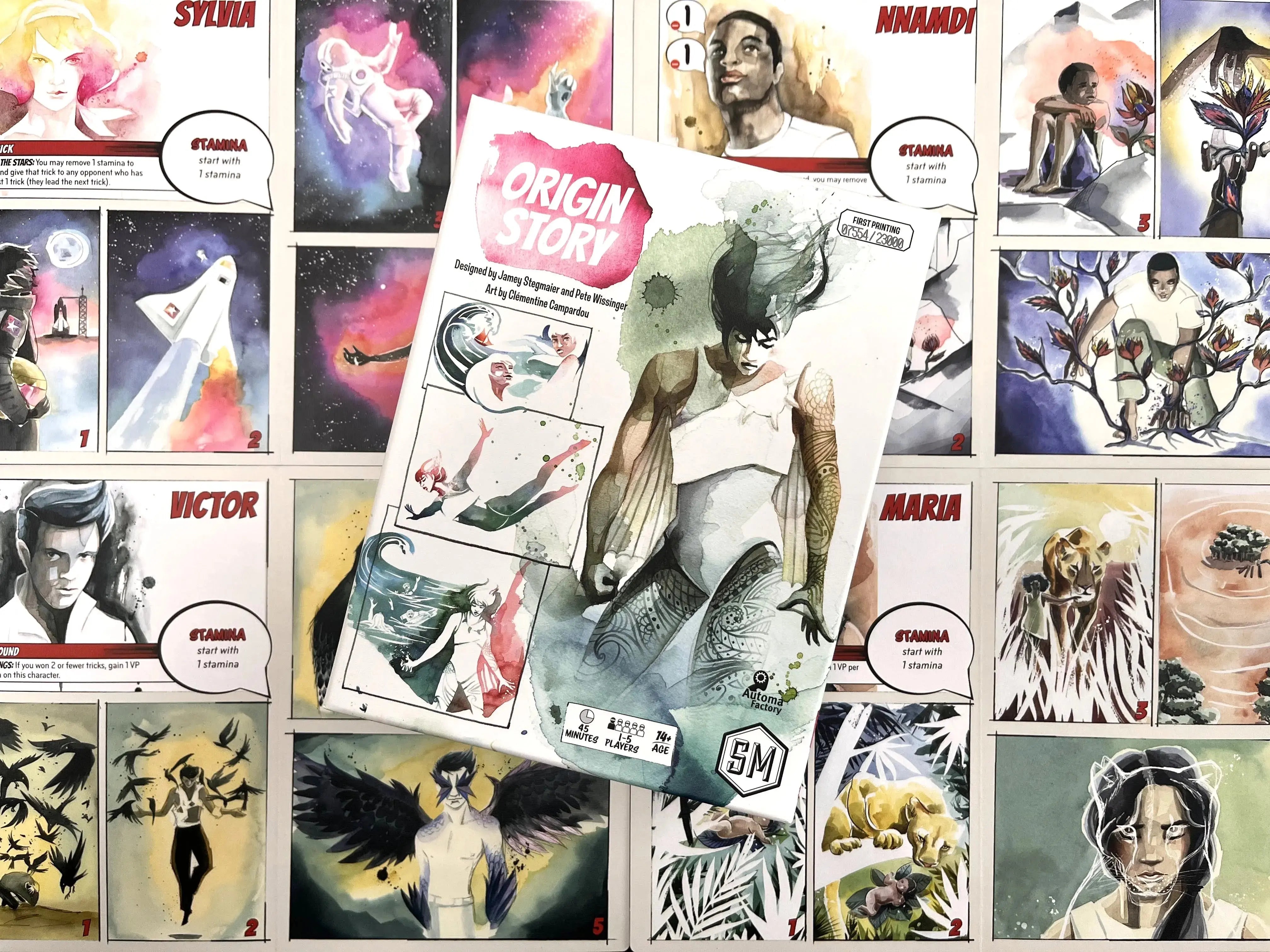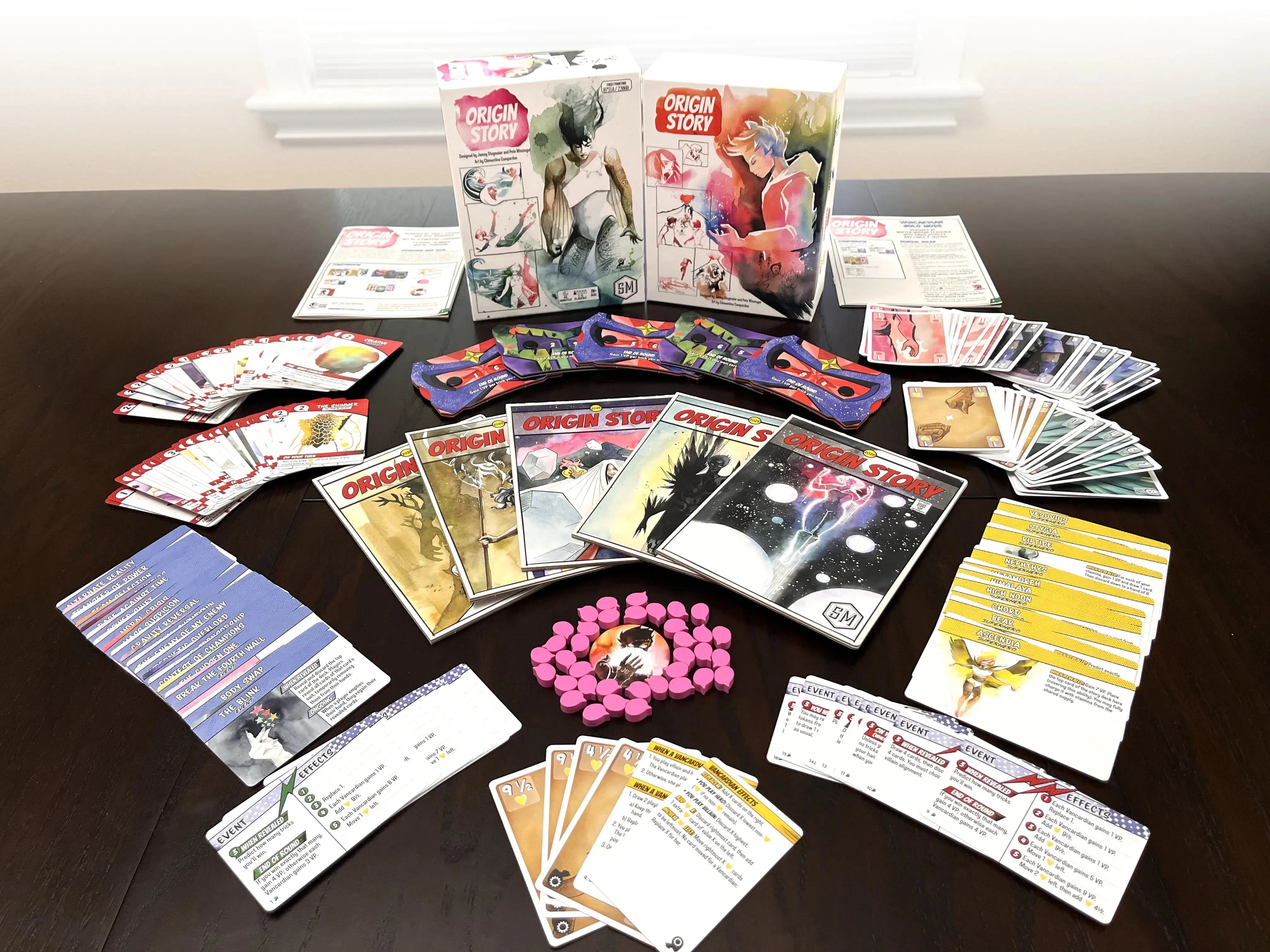 Designed by Jamey Stegmaier and Pete Wissinger, Origin Story is an engine-building, trick-taking game played over 5 rounds. Each round represents a chapter in your development and grants a new card to add to your player mat. Charge your cards and use their abilities to score more points than your opponents.