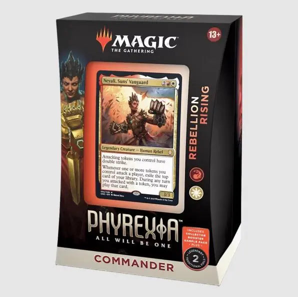 This Phyrexia: All Will Be One Commander Deck set includes 1 ready-to-play deck of 100 Magic cards (2 traditional foil legendary cards, 98 nonfoil cards), a 2-card Collector Booster Sample Pack, 1 foil-etched Display Commander (a thick cardstock copy of the commander card with foil etched into the card’s border and art), 10 double-sided tokens, 1 deck box (can hold 100 sleeved cards), 1 Life Wheel, 1 strategy insert, and 1 reference card.