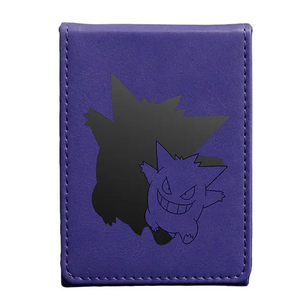 The Alcove Flip Box for Pokémon features a debossed image of Gengar on a leatherette finish with premium foil detailing. A strong magnetic closure keeps your cards safely secured inside, and dual thumb notches offer easy access to your deck. This Deck Box® holds up to 100+ standard size trading cards double-sleeved in Ultra PRO Deck Protector® sleeves. The lid can be detached from either side of the box to accommodate any play style.