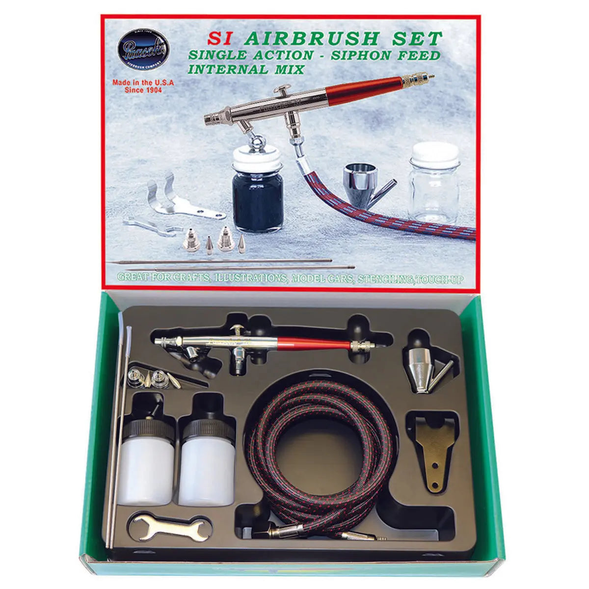 The SI airbrush is single action but also internal mix which keeps operation simple but allows for better detail than external mix models. Included with the airbrush are all three available spray heads, which allow the SI airbrush to be used in a wide range of application. The SI single action allows the user to achieve fine lines down to 1/32 inch and wider patterns of up to 1-1/2 inches. . The best uses are those requiring more basic spraying like solid coats, uniform lines or stencil work. Clean up is as simple as spraying your paint cleaner though the airbrush. The SI is used for many applications including hobby, craft, chip and ding repair, taxidermy, ceramics, cake decorating, tanning, tattoos, etc. The SI airbrush is made in the US and includes the following: SI#3 airbrush, size 1 & 5 spray heads, 1/4 oz metal cup, 1 oz bottle assembly, 1 oz storage bottle, hanger, wrench, 6 ft braided hose, lessons booklet and manual.