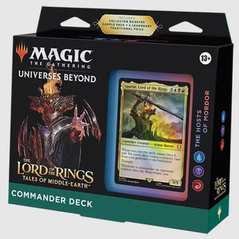 The Lord of the Rings: Tales of Middle-earth Elven Council Commander Deck set includes 1 ready-to-play Green-Blue deck of 100 Magic cards (2 Traditional Foil Legendary Creature cards, 98 nonfoil cards), a 2-card Collector Booster Sample Pack (contains 1 Traditional Foil or nonfoil special treatment card of rarity Rare or higher and 1 Traditional Foil special treatment Common or Uncommon card), 1 foil-etched Display Commander (a thick cardstock copy of the commander card with foil etched into the card’s border and art), 10 double-sided tokens, 1 Helper card, 1 deck box (can hold 100 sleeved cards), 1 Life Wheel, 1 strategy insert, and 1 reference card.