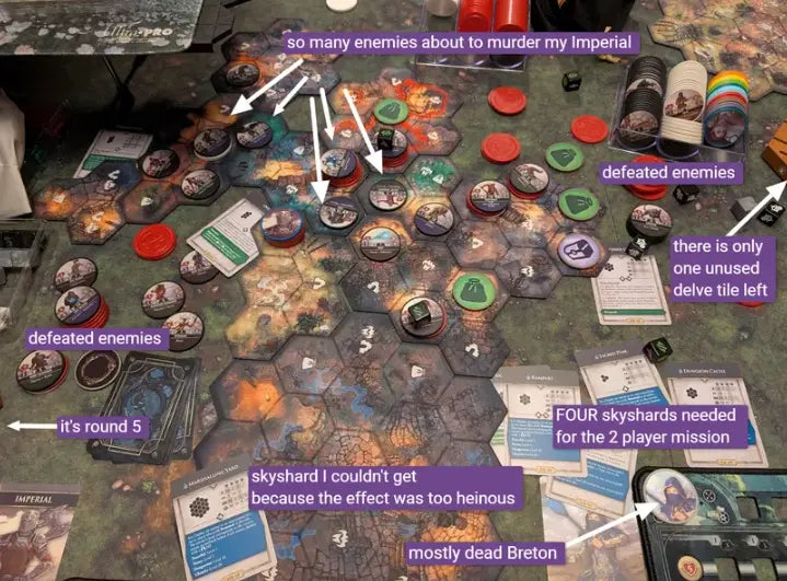 Each adventure in the game takes place over the course of three gameplay sessions, with sessions being roughly two hours plus an additional half hour per player in length. Players customize and control a single hero throughout all three sessions of an adventure as they manage multiple skill lines, classes and experience the many regions of Tamriel, each with their own unique flavor and mechanics. Experience points are handed out generously, allowing players to build interesting and unique characters in the consolidated timespan required in a tabletop experience. Session to session progression is meaningful, but players are not required to remember complex narrative points or play with the same group forever.