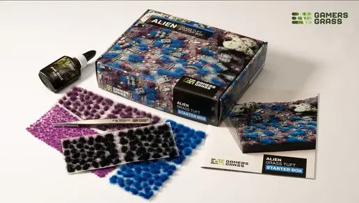 This Starter Box contains 4 full sheets of Grass Tufts, 1 Pair of Tweezers, 1 Bottle of PVA glue and 1 Basing Guide Booklet.